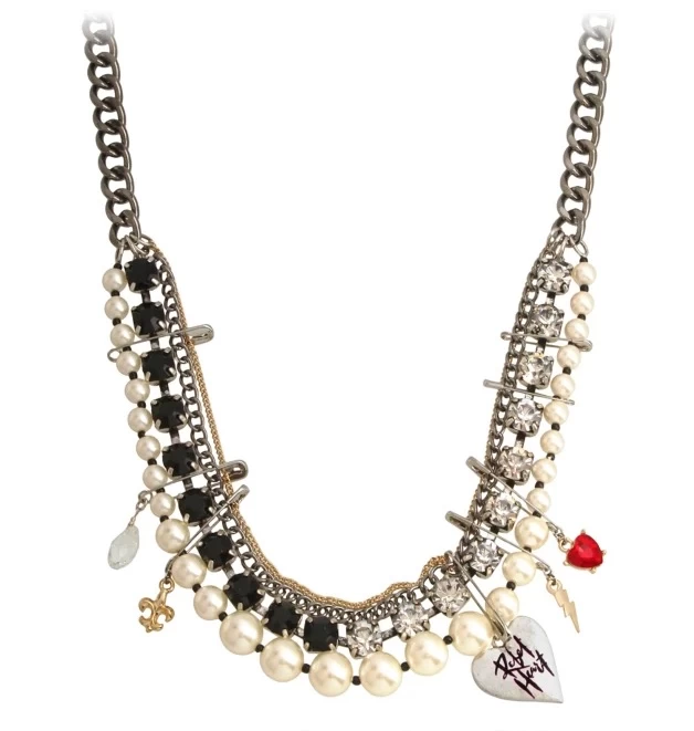 Show both sides of your style with this distinctively Betsey Johnson Cruella necklace featuring very proper faux pearls alongside black and white faceted gems and safety pin accents, to keep your look on point. Inspired by the title character of the new live-action film, this adjustable necklace also features a curb chain and several charms including a ”rebel heart.”