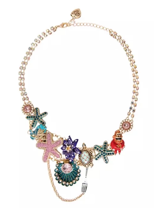 Betsey Johnson brings her bold, bright aesthetic to this splashy Ariel-inspired collar necklace. Ride a high fashion tide to compliments and admiring looks with its double strand necklace of iridescent stones and the undersea treasure trove of pendants featuring glittering, stone-encrusted coral, Flounder and Sebastian figures, a dazzling seashell, and more.