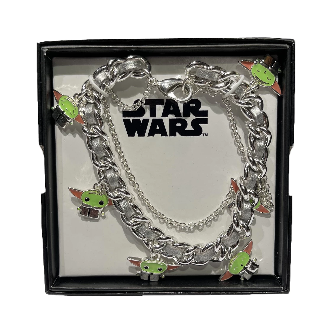 This chain linked Star Wars Bracelet features 6 Baby Yoda Charms. Perfect for any Star Wars Fan.