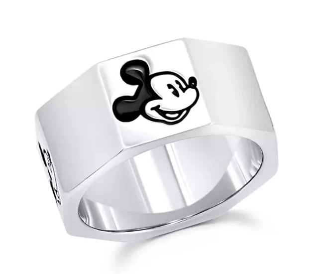 Square away your accessories with this sterling silver Mickey Mouse ring. An inset image of our icon’s face appears with enameled accents on two sides of this unique, octagonal ring.