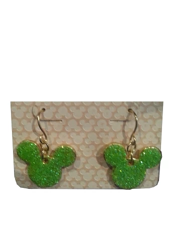 these beautiful Mickey Mouse Icon Earrings, Features Mickey Mouse Icons full of green glitter on gold french wire hooks.