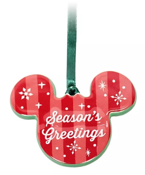 Make your holiday décor swell this season with our ceramic Mickey Mouse icon ornament featuring green stripes on one side and red plaid on the reverse. Two merry messages and a satin ribbon for hanging make it a festive accent for tree.