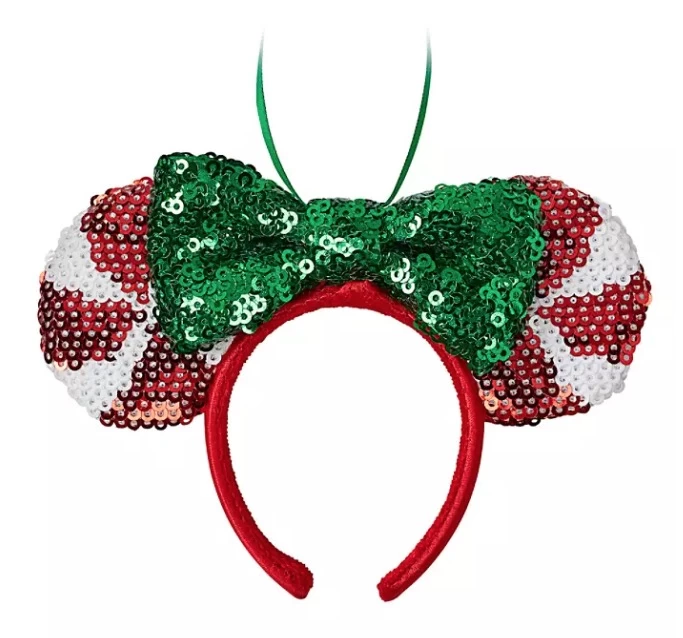 Add a novel twist to your holiday décor with this Minnie Mouse Ear Headband Ornament. The miniature version of the classic sequin design features peppermint twist ears and green bow.