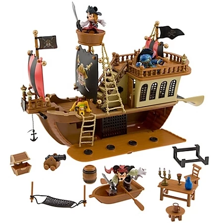Adventures of the imagination await Mickey and friends in our Deluxe Mickey Mouse Pirates of the Caribbean Pirate Ship Play Set with four Disney figurines in swashbuckling costumes inspired by the films. This toy pirate ship provides hours of fun. Send a misbehavin’ scoundrel down the hatch to the hold, then drop your anchor when you reach land. Send the rowboat to shore to search for hidden treasure!