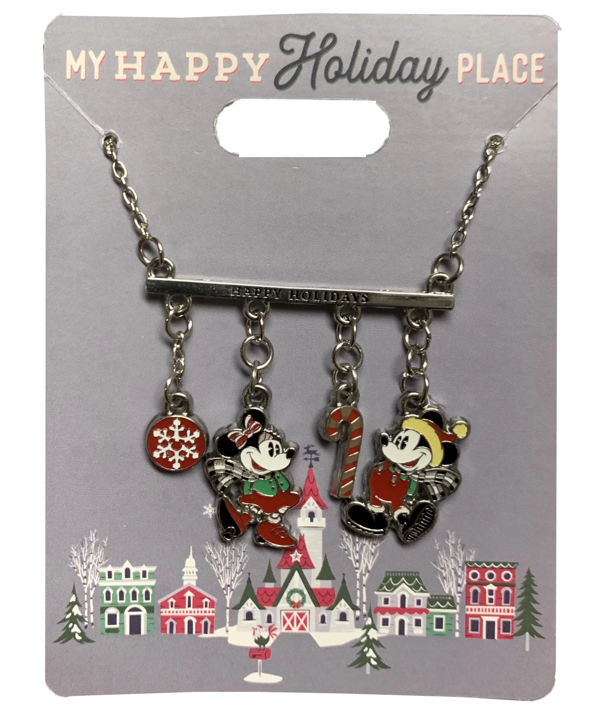Get Festive this Holiday with this sweet Necklace with Mickey and Minnie. Features Mickey, Minnie, a Candy cane, and a Snowflake charm, with the words Happy Holidays above them.