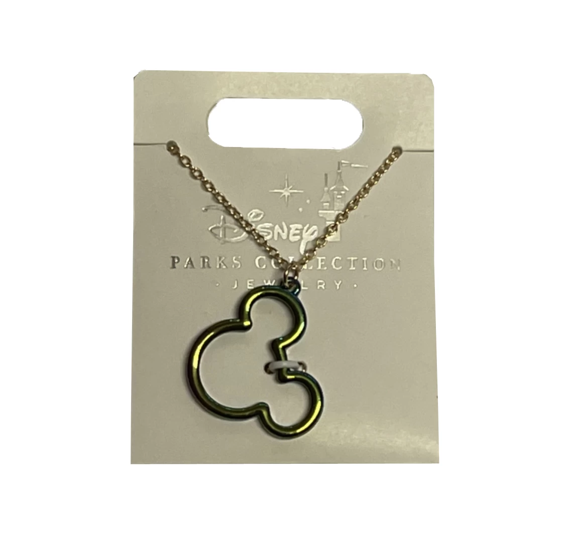 This Beautiful Mickey Icon Necklace has hints of purple and blue, on a gold linked chain.