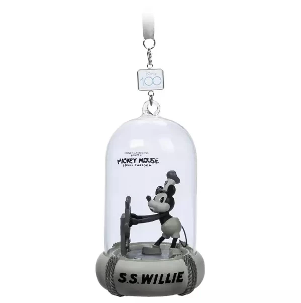 Mickey reprises his debut role as ”Steamboat Willie” for this Living Magic Sketchbook Ornament with lights and whistling sounds. Fully sculpted, Mickey poses at the sternwheel under a clear glass dome.