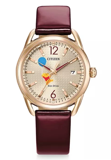 Winnie the Pooh’s constant quest for hunny sees him hanging beneath a blue balloon on this Citizen watch that blends whimsy and elegance. Pooh is complemented by a rose gold-tone stainless steel case with a burgundy patent leather strap, and Eco-Drive technology so no batteries are required.