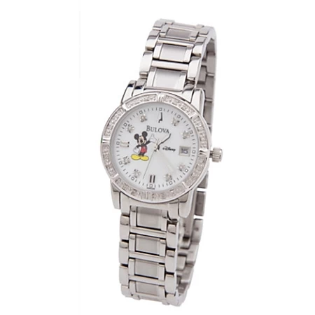 This diamond Mickey Mouse watch is sure to be a girl’s best friend. Designed by the renowned watchmakers Bulova, this elegant ladies’ timepiece features a bezel and face inlaid with dazzling diamonds so you’ll have time to sparkle!