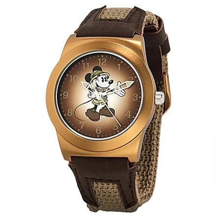 You’ll never be in search of the hours wearing Mickey’s exotic safari watch. This timepiece features an ”antiqued” face and bronze tone casing with a strapping khaki band, all just waiting for the next adventure to begin.